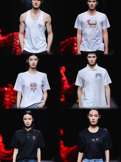 一是非遺技藝與現(xiàn)代設(shè)計(jì)交相輝映。本次時(shí)尚之夜以“時(shí)尚灣區(qū)•非遺新造”為主題,匯聚了粵港澳三地22個(gè)非遺服裝品牌。其中,利工民的展演作品尤為亮眼——品牌巧妙融合國(guó)家級(jí)非遺“粵繡(廣繡)”的細(xì)膩針?lè)ㄅc區(qū)級(jí)非遺“利工民汗衫背心制作技藝”的經(jīng)典工藝,打造出系列“非遺潮T”。走秀環(huán)節(jié)中,模特身著的這些汗衫背心看似簡(jiǎn)約,實(shí)則暗藏巧思:胸前精致的青銅紋樣與醒獅圖案,是廣繡技藝與百年汗衫工藝的完美對(duì)話;特別是“饕餮紋”的黑色背心,古老紋樣經(jīng)現(xiàn)代設(shè)計(jì)煥變?yōu)槌笨釄D騰,生動(dòng)詮釋了傳統(tǒng)技藝在當(dāng)代服飾中的創(chuàng)新表達(dá)。