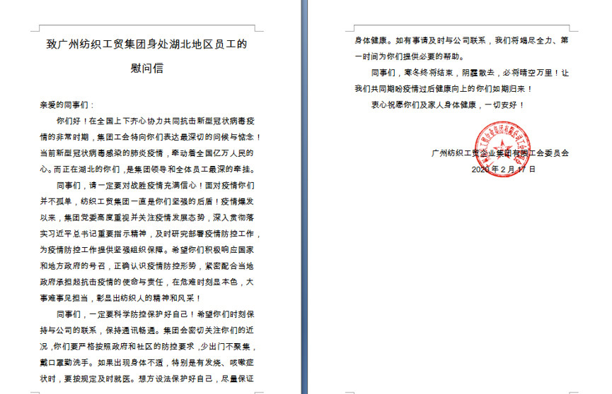 集團(tuán)工會自2月17日發(fā)出《廣州紡織工貿(mào)集團(tuán)湖北籍及身處湖北地區(qū)員工的慰問信》,向9名身處湖北地區(qū)的員工們轉(zhuǎn)達(dá)了集團(tuán)領(lǐng)導(dǎo)和全體員工對疫區(qū)同事最深的牽掛,鼓勵他們要充滿信心,一定能戰(zhàn)勝疫情,后方溫暖大集體是他們的依靠,等著他們安全歸來!